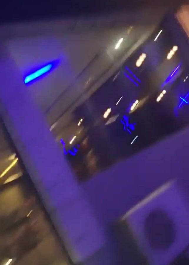 The video begins with a low-angle shot of a building exterior, featuring stairs illuminated by recessed lights. The building appears to have large windows, reflecting interior lights. The camera then pans up, showing more of the building's architecture, including what looks like an air conditioning unit and additional lighting fixtures. The camera then pans further up to reveal a night view, including a car parked outside the building and a street lamp. The overall lighting is dim, with a noticeable blue tint. The scene appears to be outside a commercial establishment, possibly at night.