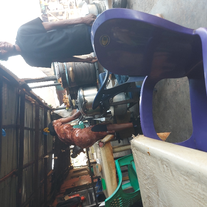 This image depicts an informal outdoor food preparation and dining area within Kuru, Nigeria. In the midground, a female subject, wearing a tight-fitting brown patterned dress with a yellow head covering, leans over a large silver pot placed on a makeshift cooking stand. To her right, a male subject in a black t-shirt and dark trousers stands upright, looking towards the left. The immediate foreground features a light-colored table partially obscured on the left, and a purple plastic armchair with a prominent back on the right, facing into the scene. To the left, another light-colored table is visible, accompanied by green plastic chairs, and a light green bowl rests on its surface. The cooking area includes several dark, drum-like containers and trays with what appears to be prepared food (e.g., fried items) in the background. The structure consists of a corrugated metal roof supported by wooden beams. The ground is packed earth or concrete. Clothing or fabric items hang on the far left. The overall environment suggests a bustling, functional establishment under natural daylight.