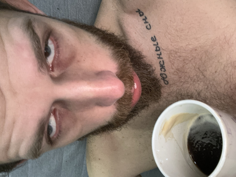 A close-up, slightly tilted shot focuses on a man's face, revealing a beard, open eyes, and pronounced features. A tattoo is visible on his chest. A paper cup, containing a dark liquid and a hint of light-colored residue, sits near his chin. The overall composition presents an intimate, casual scene.