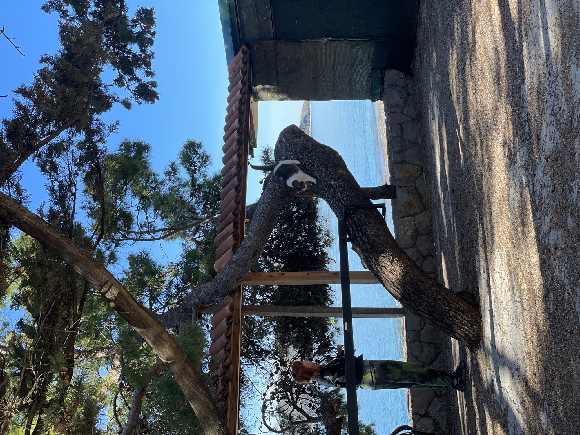 A person is standing on a balcony, near a tree that is growing through the balcony. The tree has a cat on it. The balcony overlooks the Adriatic Sea, with the location being Rafailovići, Montenegro. The sky is clear. The building has a weathered exterior.