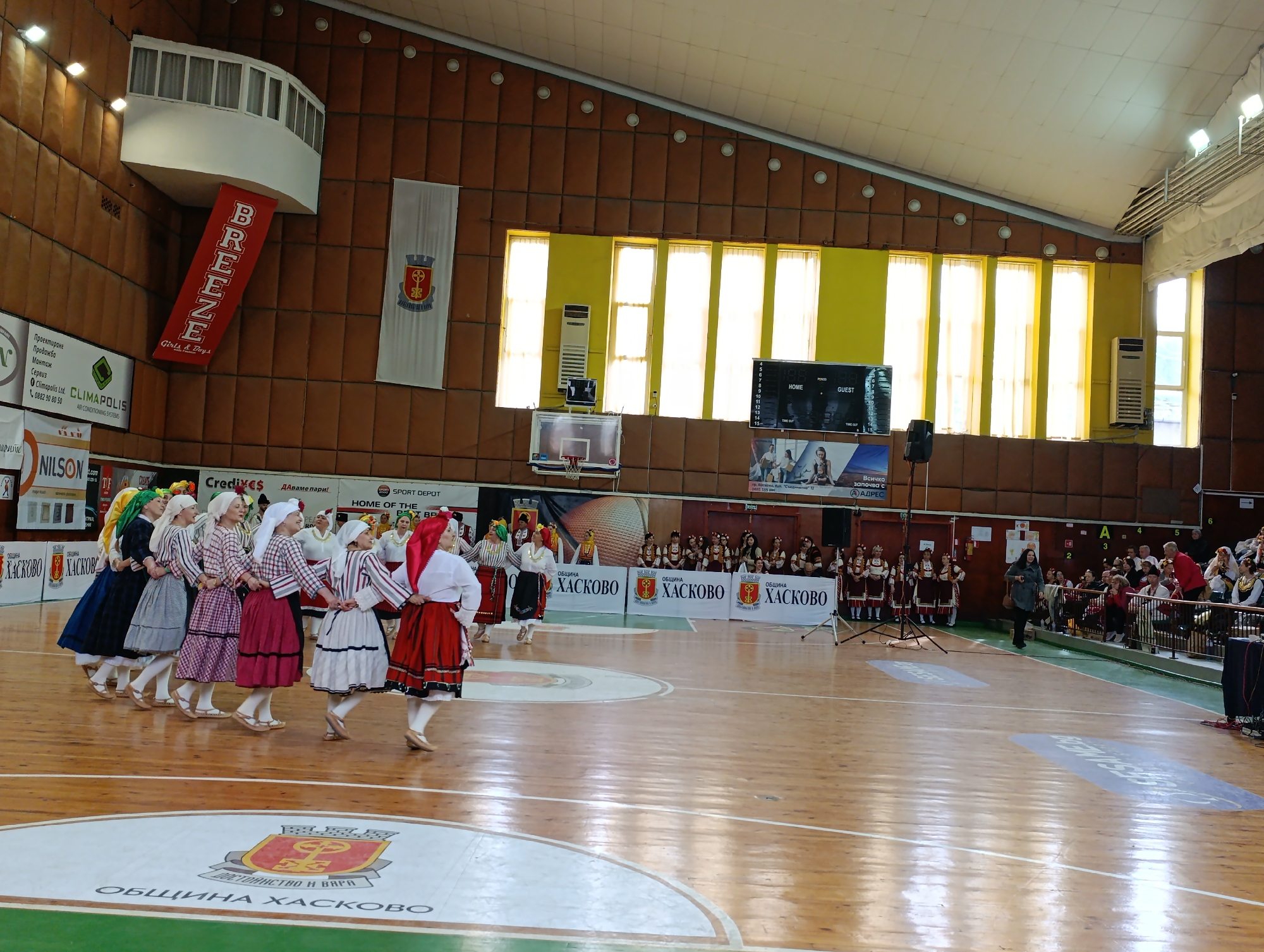 The scene depicts an event inside a large indoor sports hall on a wooden basketball court. The floor features white court markings and two large circular logos of "ОБЩИНА ХАСКОВО" (Municipality Haskovo) with its coat of arms. On the court, a group of approximately ten women are performing a traditional folk dance (hora) in a circular formation, holding hands. They are dressed in various traditional Bulgarian costumes, including white blouses, patterned skirts (red, white, checkered, blue), aprons, and headscarves, some with floral embellishments. Their footwear appears to be light-colored flats or sandals. To the right, a woman in a grey jacket and dark pants walks across the court. Further to the right, a section of bleachers holds numerous spectators, many of whom are also dressed in traditional folk costumes. Several individuals, including adult males, are visible among the seated audience. The walls of the hall are paneled in a brown, possibly wooden or composite, material, with a lighter yellow section behind a row of tall, rectangular windows on the far wall that emit bright light. Above these windows, the wall angles upwards, leading to a white, grid-paneled ceiling with recessed lighting. On the upper left wall, a white, semi-circular observation booth or balcony is visible, below which hangs a red vertical banner reading "BREEZE Girls & Boys." Adjacent to it is a white banner displaying the Haskovo coat of arms. Along the far wall, a digital scoreboard displaying "HOME" and "GUEST" scores, "PERIOD," and "TIME OUT" is mounted, beneath which a basketball hoop is visible. Air conditioning units are mounted on the walls. Banners for sponsors such as "CLIMAPOLIS," "NILSON," "Credives," "SPORT DEPOT," and "HOME OF THE [BREEZE]" are affixed along the top of the lower wall. Black speakers on stands and a tripod with equipment are positioned near the court sidelines. White banners displaying "ОБЩИНА ХАСКОВО" are visible along the baseline.