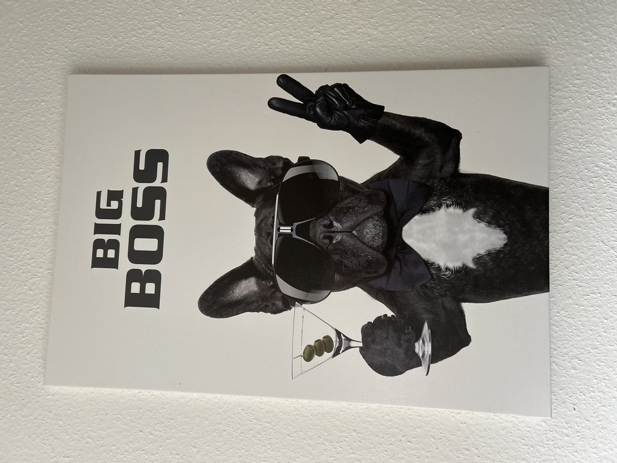 canvas print mounted on a white wall. The print depicts a black and white image of a French Bulldog wearing sunglasses and a tie, holding a martini glass with olives, and flashing a peace sign with a gloved hand. The words "BIG BOSS" are printed vertically on the left side of the canvas. The location is unknown and has not been specified.