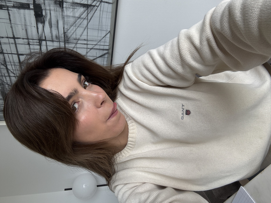 This image depicts an individual in Loures, Portugal, captured in a close-up, chest-up selfie format. **People:** A single individual, identified as an adult female, is the central subject. She has long, dark brown hair styled with a fringe. Her head is tilted slightly, and she is looking directly at the camera with her tongue subtly extended. Her complexion appears clear, with some natural redness visible on her cheeks and nose. **Objects (on person):** The individual is wearing a light cream-colored, long-sleeved, ribbed-knit sweater. The sweater features a prominent "GANT" logo embroidered in dark thread on the left chest, accompanied by a small shield emblem beneath it, displaying red, white, and blue colors. **Environment:** The background indicates an indoor setting. To the left, a portion of a modern spherical white lamp on a dark stand is visible against a plain light-colored wall. To the right, a framed piece of abstract artwork hangs on the wall. This artwork consists of dark, intersecting lines forming a grid-like pattern on a lighter, possibly gray or white, background. In the lower-left corner, a corner of a white notebook or pad with blue grid lines is visible, resting on an indistinct surface.