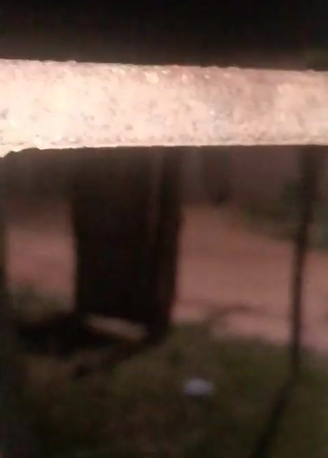 blurry view through what appears to be a rusty metal bar. The background is dark and out of focus, but it seems to be an outdoor setting with a path and some vague shapes resembling trees or buildings. The camera is shaky, and the lighting is poor, making it difficult to discern details. The camera gets more and more focused on the bar in the foreground as the clip goes on.