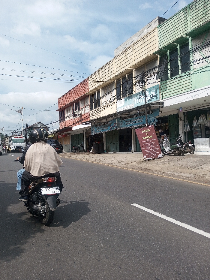 This image depicts a daytime street scene in Chhenangri_Rishor, Bhutan, characterized by an urban commercial environment under a sky with scattered white clouds. In the immediate foreground, two individuals are riding a dark-colored scooter on an asphalt road, traveling away from the viewer. The driver wears a black helmet and blue jeans, while the passenger, also wearing a black helmet, is clad in a light-colored, possibly beige, top and dark trousers. The scooter's rear license plate displays "F 5314 WBO" with "02.21" beneath it. To the right of the road, a continuous block of multi-story commercial buildings presents sections painted red-orange, beige, and light green. These structures feature dark windows and are fronted by numerous overhead electrical wires. A partially visible blue banner or awning is affixed to one building, and a freestanding brown A-frame sign on the sidewalk prominently displays "PLASTIK & KEMASAN" at its top, followed by smaller text. Two additional scooters are parked on the sidewalk near the brown sign. Further down the road on the left, a white truck with a red cab and a dark passenger vehicle are partially visible, alongside a decorative white and gold street lamp post. Shadows are cast onto the road surface from the buildings and the moving scooter.