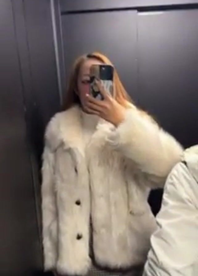 A young woman is taking a selfie in an elevator. She is wearing a white faux fur coat, a beige and brown plaid miniskirt, black tights, and white knee-high boots. She has highlighted blonde hair, winged eyeliner, and pink blush. The woman is holding up a black cell phone with a white and black graphic patterned case. Behind her, part of another person is visible, wearing a white jacket and a patterned bag. The elevator interior is simple, with gray walls and a white light overhead.