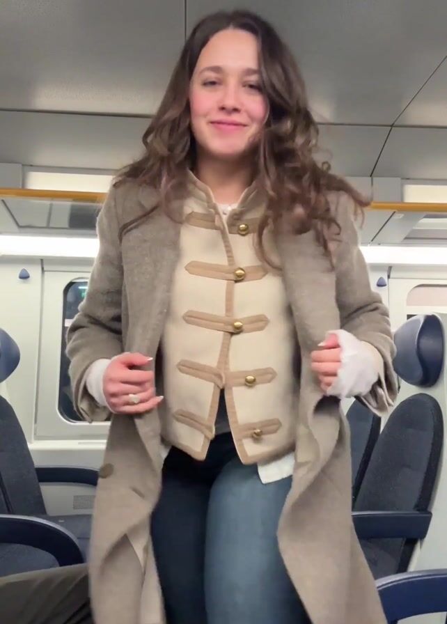 A smiling woman with long brown curly hair is on a train. She is wearing a long, light brown wool coat over a white shirt and a beige vest with gold buttons and a plaid pattern. She is buttoning the vest while looking down. The train car is mostly empty with blue seats visible behind her.