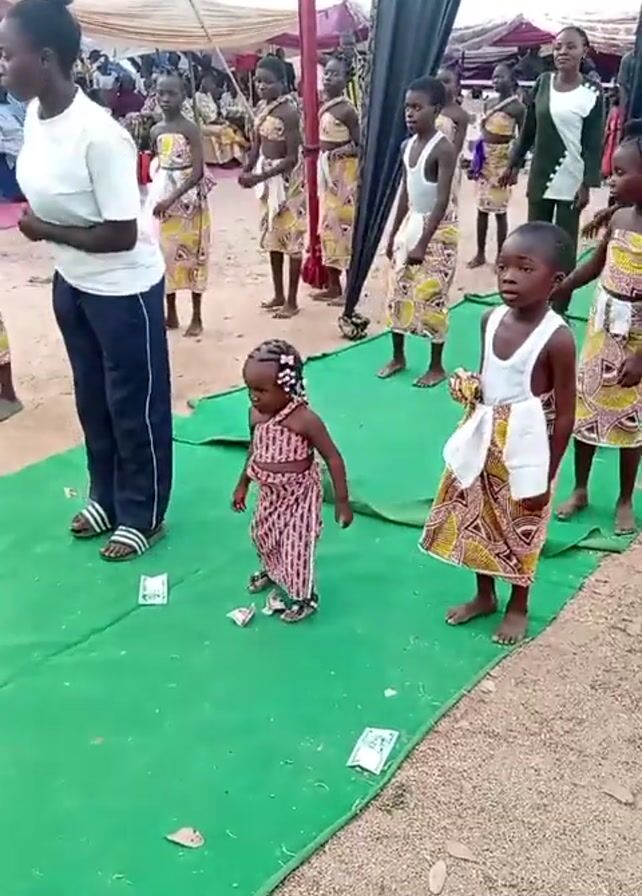 A group of children, mostly wearing colorful traditional West African attire over white tank tops, stand on a green carpet. A woman in a white shirt and navy blue pants stands to the side, leading them. Some of the children hold white towels or cloths. Scattered on the carpet are several paper notes, likely currency. The children are dancing or performing a routine to music playing in the background. The setting appears to be an outdoor event, possibly a celebration or performance, with decorations and people visible in the background. The ground is mostly dirt and gravel.