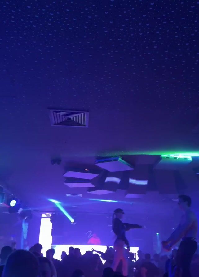lively scene in what appears to be a nightclub or a large party venue, packed with people enjoying themselves. A performer in a black outfit and cap stands on an elevated platform, possibly a stage, with smoke effects around them. Next to the performer stands a shirtless person wearing black pants. The audience below is a mix of genders and attires, and they appear to be dancing and engaging with the music and performance. The lighting in the venue is dynamic and colorful, switching between shades of blue, white, and purple. There are multiple light fixtures, including spotlights and LED panels, adding to the energetic atmosphere. Throughout the video, the camera moves, capturing the crowd, the performers, and the overall ambiance of the event.