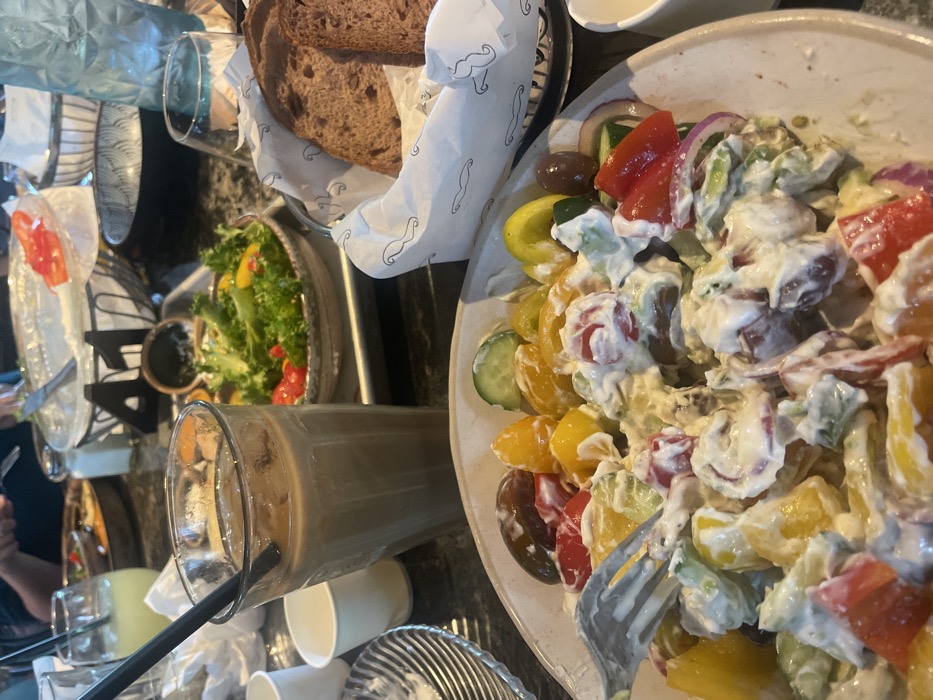 The image displays a dining table scene within a restaurant or cafe in Tel Mond, Israel. In the foreground, a large white bowl holds a vibrant salad consisting of diced red, yellow, and orange bell peppers or tomatoes, cucumber slices, red onion, and dark olives, thoroughly coated in a creamy white dressing. A silver fork is partially inserted into the salad. To the left, a tall glass contains a brown, iced beverage with a black straw, accompanied by a small empty white paper cup and a striped ceramic plate. To the right, a metal bread basket, lined with white paper featuring repeating black mustache patterns, holds several slices of dark, whole-grain bread. Behind these items, a bowl of green lettuce salad with cherry tomatoes and yellow bell peppers is visible on a dark tray. The background shows a blurred view of a dark tabletop with additional dishes, including a partially consumed large white bowl with tomato slices and a metal basket. A prominent black metal table number "41" is positioned in the mid-background. A glass containing a light yellow beverage and the blurred arm of another diner are also discernable, indicating multiple occupants at the table.