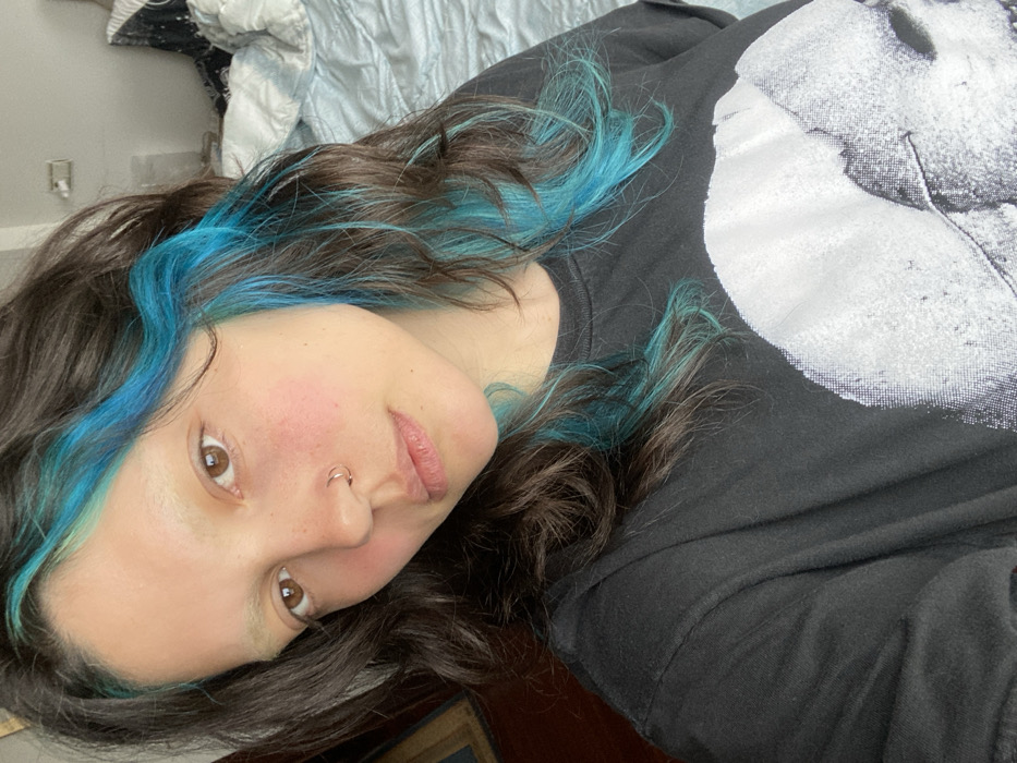 The image presents a close-up, chest-up portrait of a young adult female. She has wavy dark brown hair with prominent bright blue streaks framing her face and extending through the mid-lengths. Her eyebrows are light-colored, contrasting with her light brown eyes. A small, metallic hoop piercing is visible in her right nostril. Her skin appears fair, with a natural flush on her cheeks. She maintains a neutral expression, looking directly forward. She is attired in a black t-shirt featuring a large, partially visible white graphic on the chest, which depicts stylized lips or a mouth with a textured appearance. The background is blurred, indicating an indoor setting. To the left, a dark, rectangular object with a golden frame is faintly visible. To the right, a bed with light blue, rumpled bedding is present. The specific city location of Gijón, Spain, cannot be determined from the visual information provided in the image.