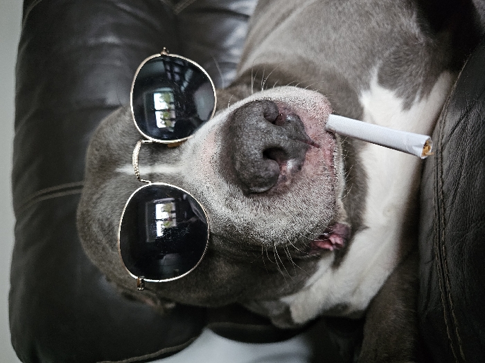 The image depicts a close-up of a grey and white brachycephalic dog, possibly a Pit Bull or similar breed, resting on a dark, upholstered surface, consistent with a leather sofa or armchair. The dog wears round, gold-rimmed sunglasses with dark lenses. An unlit, white-wrapped cigarette with a brown filter tip is positioned horizontally in its mouth, resting just above the lower lip. Reflections in the sunglasses show an indoor environment with visible windows and ambient light. The specific location within the city of Esch-sur-Alzette, Luxembourg, cannot be determined from the visual information provided.