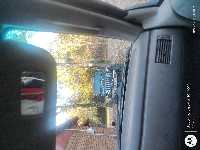 view from inside a vehicle, with a classic Jeep visible through the windshield. The Jeep is parked on a driveway or road, framed by trees. The dashboard and interior details of the vehicle where the photo was taken are prominent. A vent is visible on the dashboard. The date and time are stamped in the corner, along with the device used to take the photo. The image is rotated counter-clockwise.
