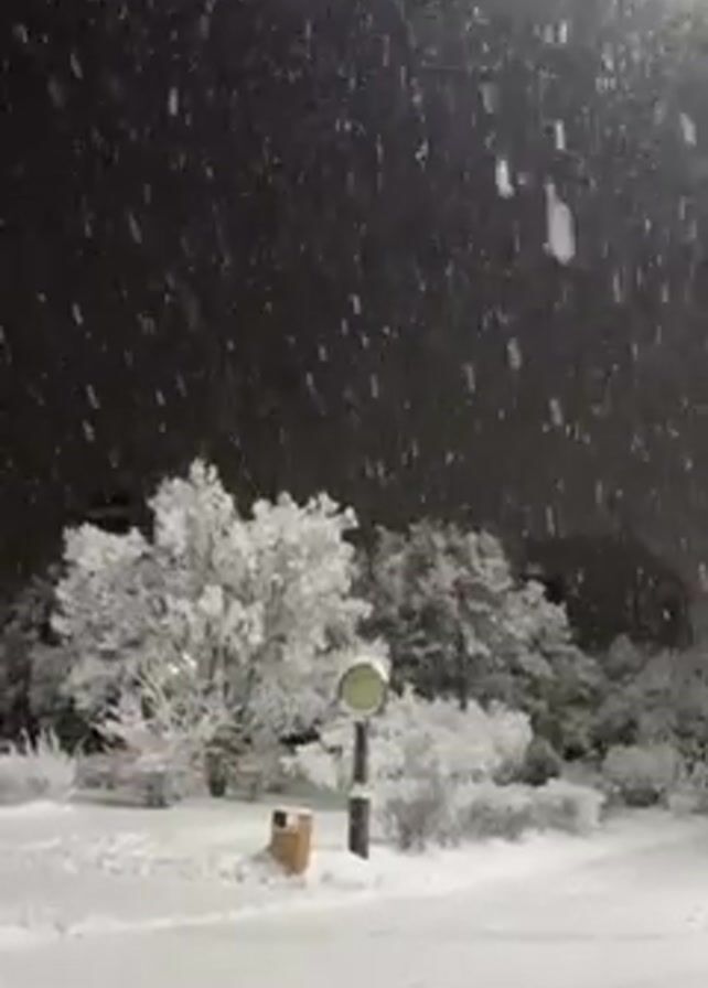 The video depicts a snowy landscape at night, likely a park or residential area