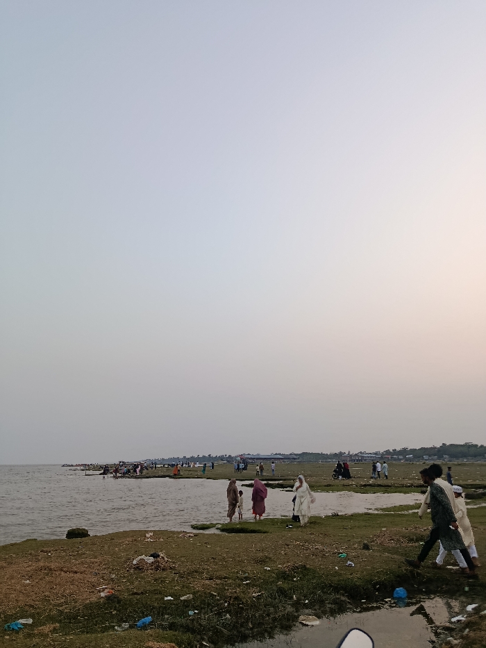 The image captures a waterfront scene in Charfasson Sadar, Bangladesh, under a clear sky exhibiting a gradient from light grey-blue to a faint peach hue on the right, indicating late afternoon. A body of water, possibly an estuary or river, extends across the left and central midground, meeting an uneven, partially submerged bank composed of sparse grass, mud, and dry earth. Scattered debris, including blue and white plastic bags, is visible on the foreground bank. Approximately 20-30 individuals are present along the shoreline. In the foreground, right of center, a person wearing a dark patterned tunic and light trousers walks towards the right, accompanied by a child in a white tunic. To their immediate left, a woman dressed in a white hijab and white long dress wades through shallow water. Further to the left, two individuals stand partially submerged in the water near the bank; one is in a maroon-colored dress, and the other wears a light brown garment. Throughout the midground, numerous other people are dispersed along the water's edge and on the bank, engaged in walking, standing, and wading in the shallow water. Their attire consists of various civilian garments. A dark-colored motorcycle is parked on the grassy bank in the midground. Along the distant shoreline in the background, faint outlines of indistinct buildings or structures are discernible.