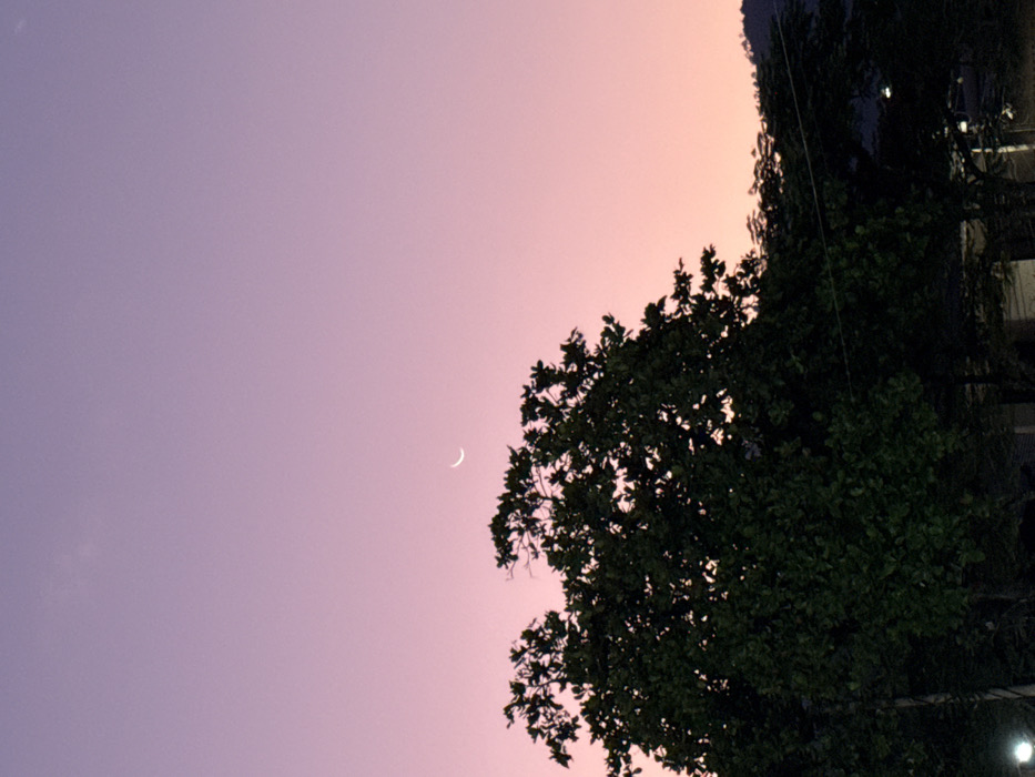 The image depicts an outdoor twilight scene in Timaná, Colombia. The sky exhibits a gradient of color, transitioning from light purple at the top to pink and orange hues towards the horizon. A thin, white crescent moon is visible in the upper sky, slightly left of center. The lower two-thirds of the frame are dominated by dense, dark green tree foliage. A large tree occupies the left and central-lower portion, with additional lower vegetation extending to the right. A partially visible circular artificial light source is located at the bottom left. A faint horizontal line, consistent with a power line, traverses the lower right. Dark, undulating silhouettes of distant hills or mountains are visible in the far background on the right. No human figures, animals, or specific activities are observed.