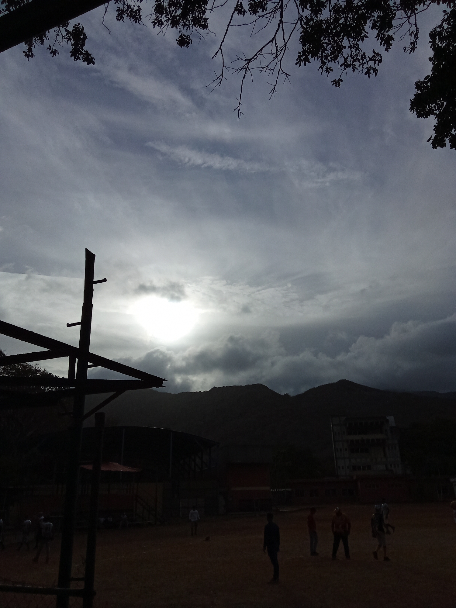 The image depicts an outdoor scene in Las Barrancas, Venezuela under a cloudy sky with the sun obscured by clouds. In the foreground, silhouetted figures of people are seen standing in a field. To the left, a partially visible metal structure frames the view. The background features a dark, shadowed landscape, including buildings and hills. Silhouetted branches and leaves are visible at the top of the frame.