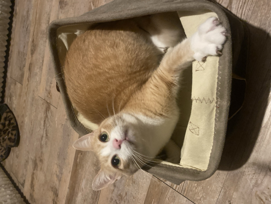 - "An orange and white cat lies in a gray, rectangular pet bed with light beige interior" by FM-xTDQG2, licensed under CC BY 4.0