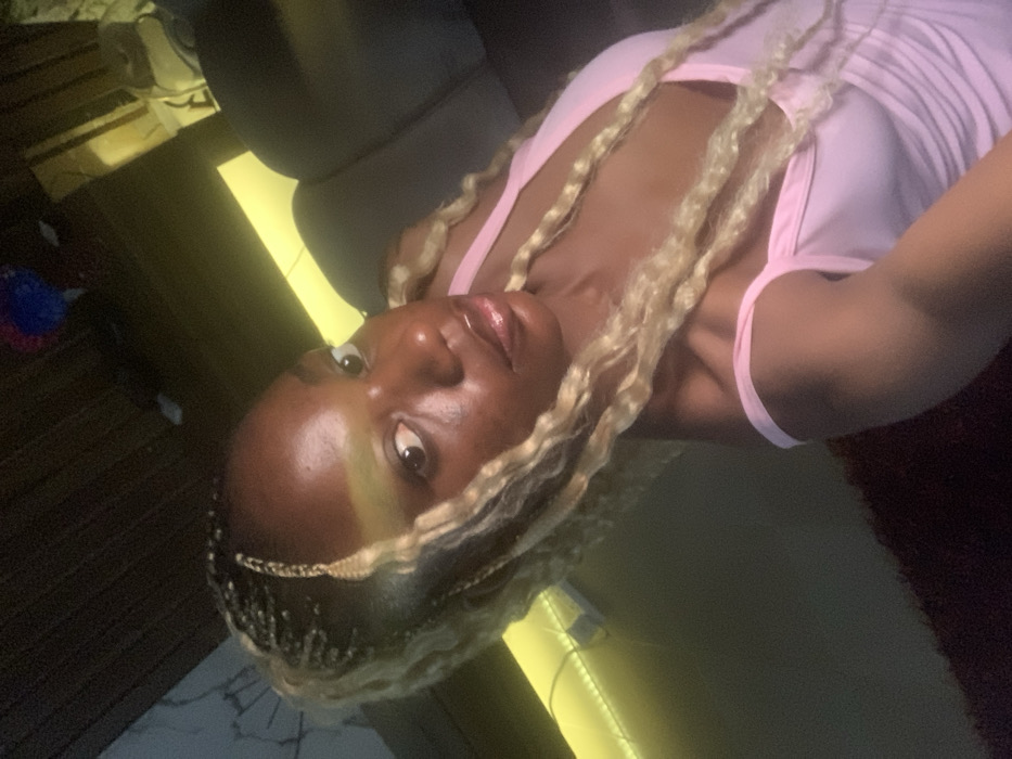 The image displays a close-up portrait of a female individual with dark skin, appearing to be in her twenties, situated indoors in Ogombo, Nigeria. She has long, numerous thin braids, predominantly blonde with some darker sections, cascading over her shoulders. A distinct, horizontally oriented greenish-yellow light reflection is visible across her forehead. The subject is wearing a light pink garment, consistent with a V-neck top or dress, with one strap positioned off her right shoulder. Her gaze is directed slightly to the viewer's right, and her lips exhibit a glossy texture. The background is dimly illuminated. A horizontal strip of bright yellow LED light is mounted on a surface behind and to the upper left of the subject. Dark furniture, consistent with the back of a sofa or chair, is partially visible to the right and behind her. Other indistinct dark shapes and a small, blurred object containing blue and red elements are present in the deeper background. The scene depicts a domestic interior environment.