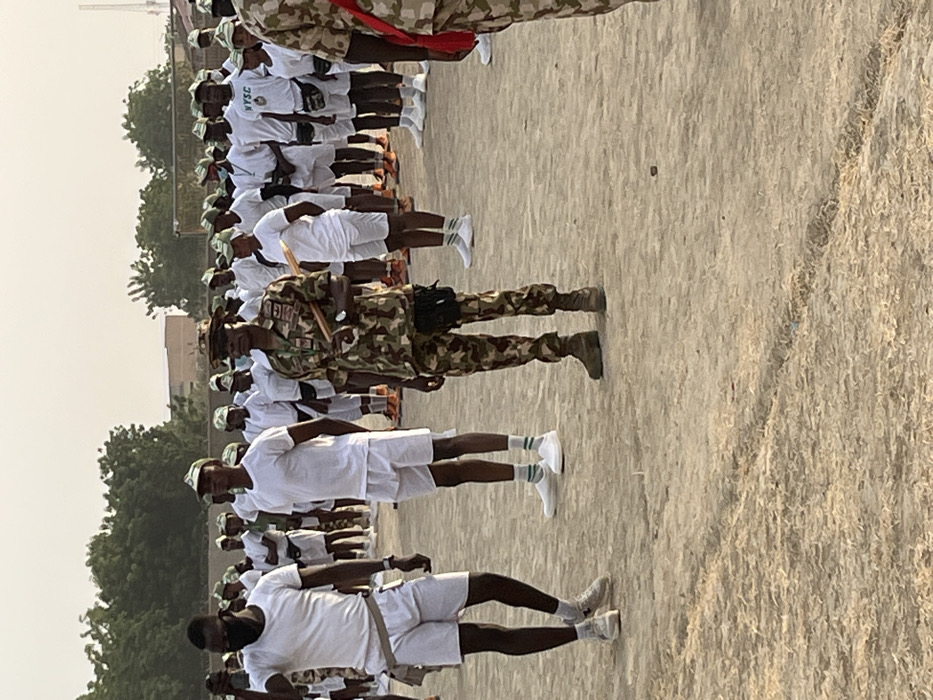 A large group of individuals stands in rows outdoors. Most are wearing white shorts, shirts, shoes, and caps. A camouflage-clad individual stands amongst them. The majority of those in white appear to be the same height. "NYSC" is visible on one of the shirts. The formation appears to be a formal line-up. The ground is tan, and some trees are visible in the background.