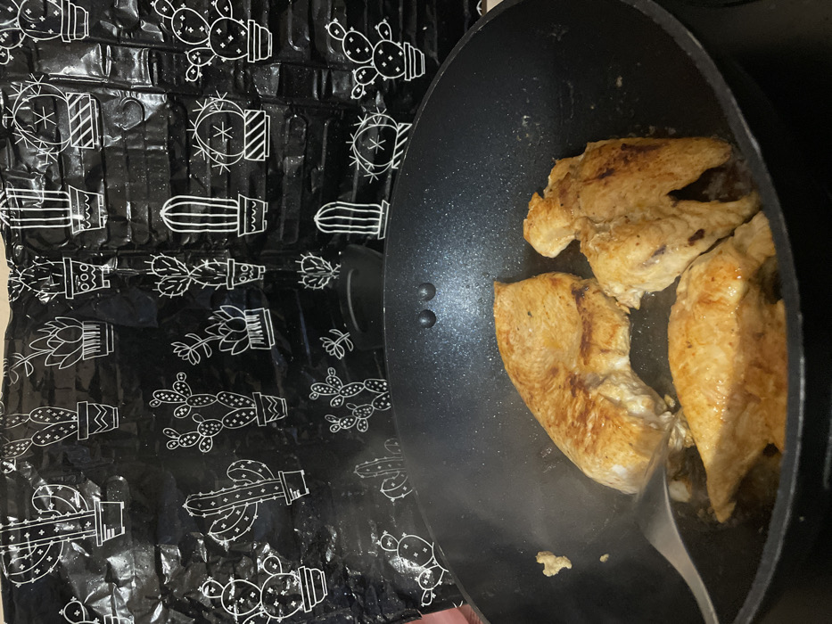 - "The image captures a kitchen scene in Blagoevgrad, Bulgaria, centered on a black non-stick frying pan containing three pieces of golden-brown chicken breast" by FM-wWAnj2, licensed under CC BY 4.0