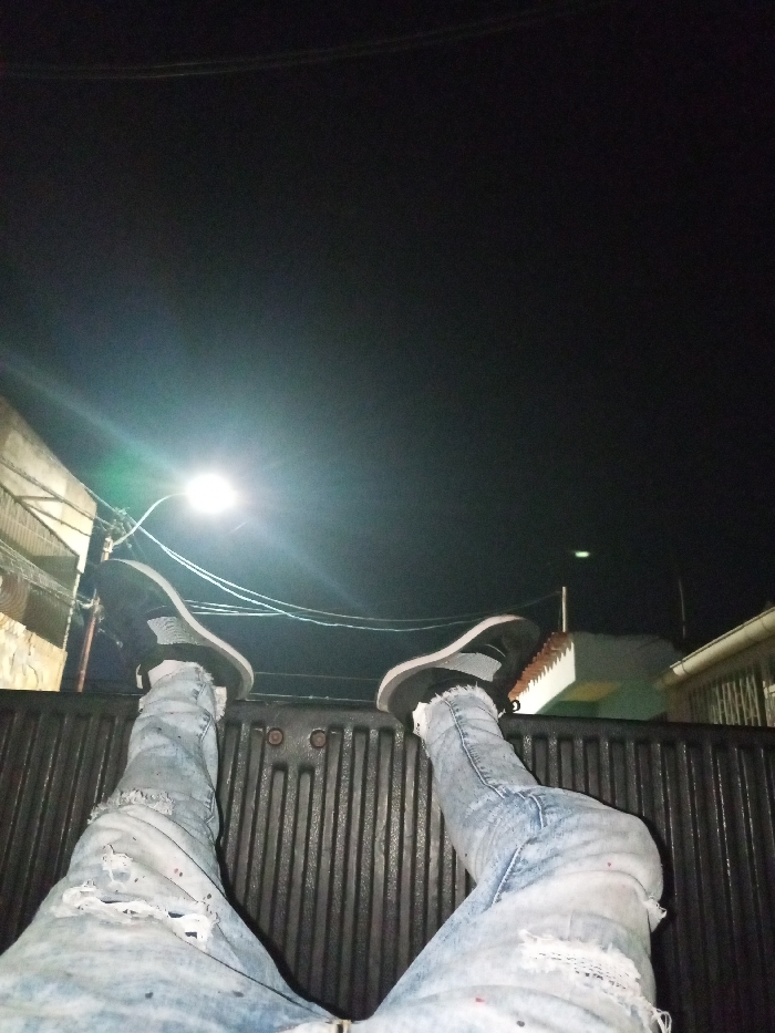 - "A first-person perspective photograph captures the lower body of an individual resting with elevated legs in the ribbed bed of a dark-colored pickup truck at night" by FM-I2UoA3, licensed under CC BY 4.0