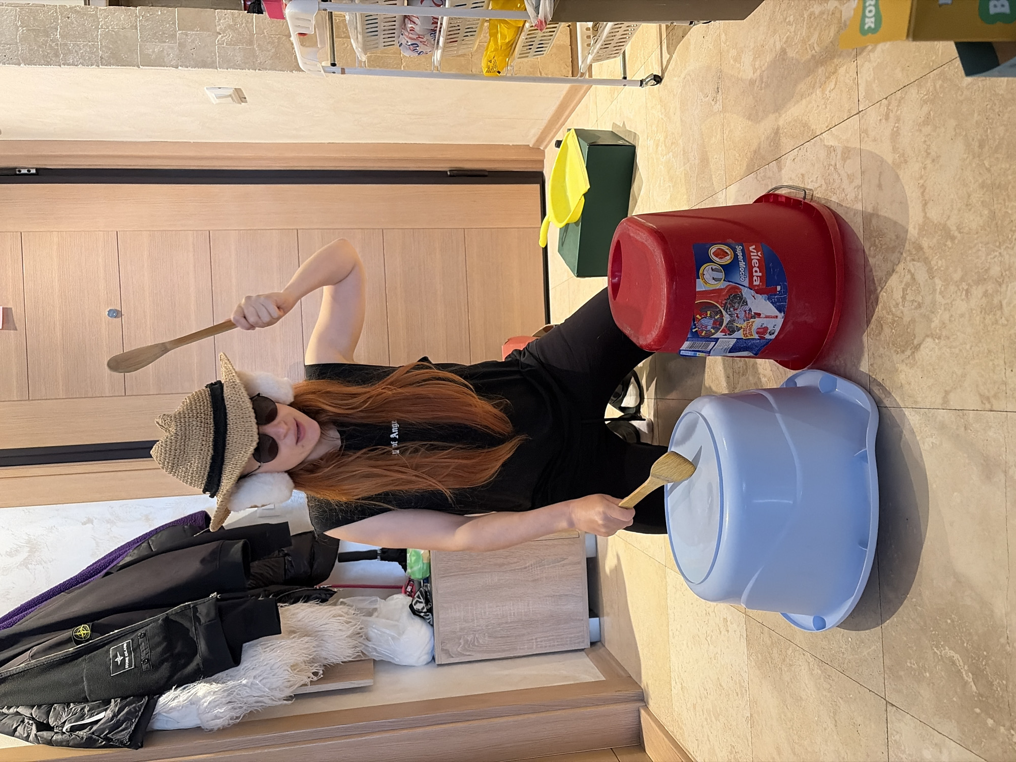 A woman is depicted indoors, likely in a private residence, judging by the presence of furniture, clothing racks, and household cleaning items. The woman, with auburn hair and wearing a hat and sunglasses, is holding wooden spoons and striking two plastic buckets - one red and one light blue. Clothing items are visible on a shelf in the background, and cleaning supplies such as buckets, mops, and laundry racks are present, indicating this might be a utility or storage area of the home. Without additional external details, it is not possible to definitively determine the location within Budva, Montenegro.