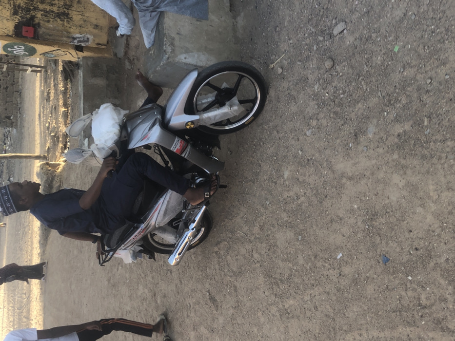 In the city of Dutsinma B, Nigeria, a young male is seated on a silver-grey underbone motorcycle on a dry dirt path