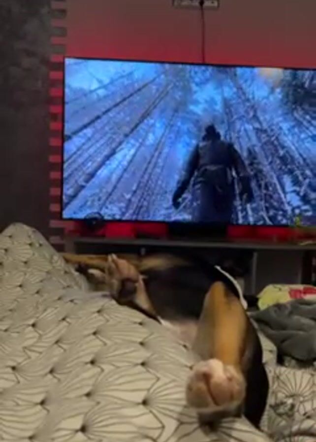 dog lying on a bed with a white and grey patterned duvet cover. The dog is on its back, playing, with its legs in the air. Behind the bed is a large TV screen, on which two men in winter clothing are seen standing in a snowy forest. The wall behind the TV is decorated with a column of red lights. The dog rolls over onto its side as the scene continues.