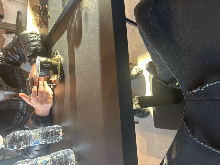 The image displays a close-up, first-person perspective from a table in Sopot, Bulgaria. A dark, rectangular table, showing minor surface scratches, occupies the majority of the frame. Seated opposite the camera is an individual wearing a black quilted jacket over a light-colored garment. Their hands are visible on the table surface, with the right hand holding a black smartphone. A black coffee cup rests on a matching saucer to their left, with several small, crumpled wrappers on the saucer. To the right, a pair of brown-tinted sunglasses with a partial colorful pattern on the arm is placed on the table. Two transparent plastic water bottles are also on the table to the left, one clearly labeled with "БАНКЯ" in Cyrillic. Strong, direct sunlight illuminates portions of the table and objects, creating distinct shadows. Below the table, the feet of both individuals are visible. The camera operator's legs are clothed in black athletic pants featuring exposed drawstrings with metallic aglets, while the person opposite wears black athletic shoes. The background suggests an indoor setting with textured wall panels.