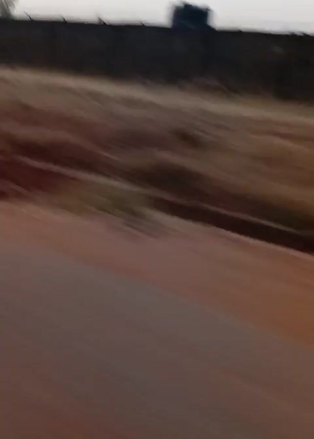 The video, taken from a moving vehicle, shows a road beside a dirt area. A tall fence lines the dirt area, with some structures visible behind it. At one point, a blurry figure of a person with a green object walks alongside the road. The sky is overcast. The primary focus is on the passing landscape next to the road.