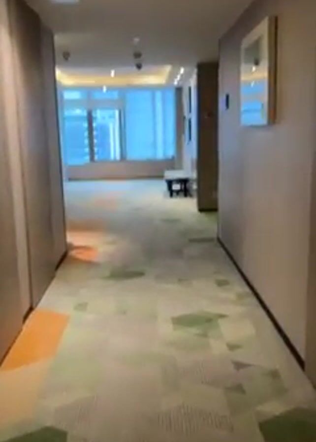 hallway with gray walls, a geometric patterned carpet, and a window at the end revealing a city view. There is a small bench in the hallway near the window. A small piece of art hangs on the right wall. The camera moves slightly forward.