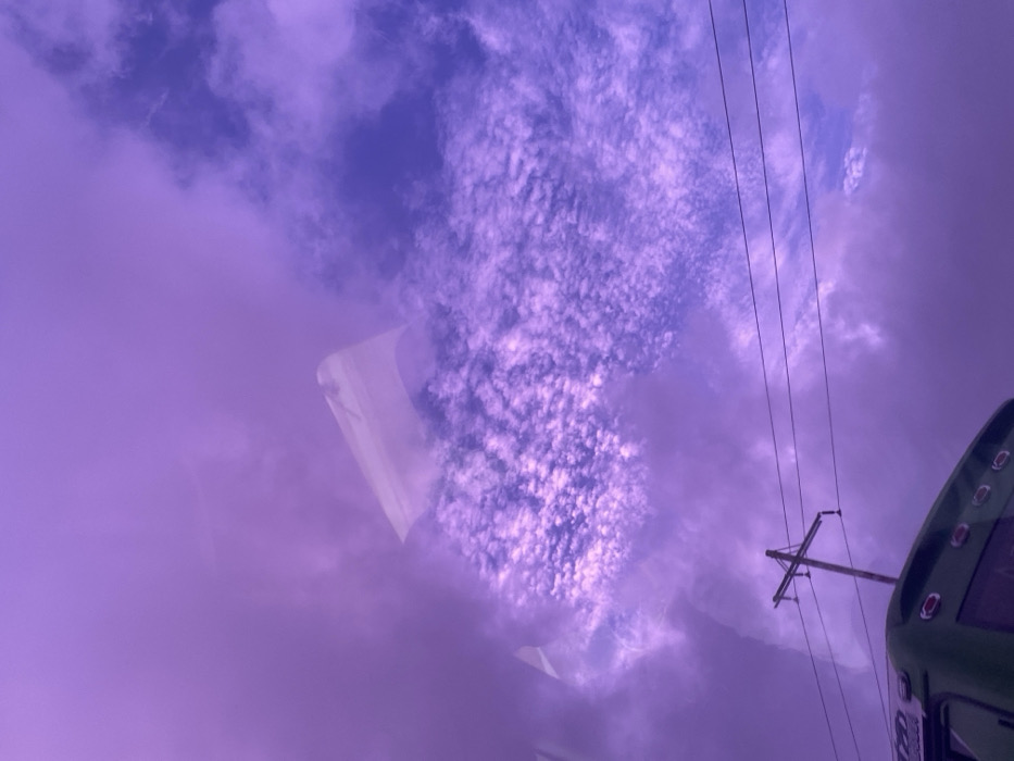 The image depicts an outdoor scene in La Cruz del Pastel, Venezuela, characterized by a predominantly purple and blue sky. The upper two-thirds of the frame are filled with clouds; dense, diffuse purple clouds occupy the left and upper sections, while a patch of textured white and purple altocumulus-like clouds is visible against a bluer sky background in the mid-right. A pale, indistinct, trapezoidal reflection, consistent with a building or structure, appears against the clouds in the upper-center, suggesting the image was captured through a reflective surface such as a window. In the lower-left quadrant, a light-colored wooden utility pole with a single crossarm is visible. Three dark utility wires extend horizontally from this pole across the lower portion of the frame. The upper-rear section of a dark green vehicle, possibly a bus, is partially visible along the bottom edge of the image, showing a curved roofline and a rectangular rear window. No individuals, specific actions, or direct interactions are visible.