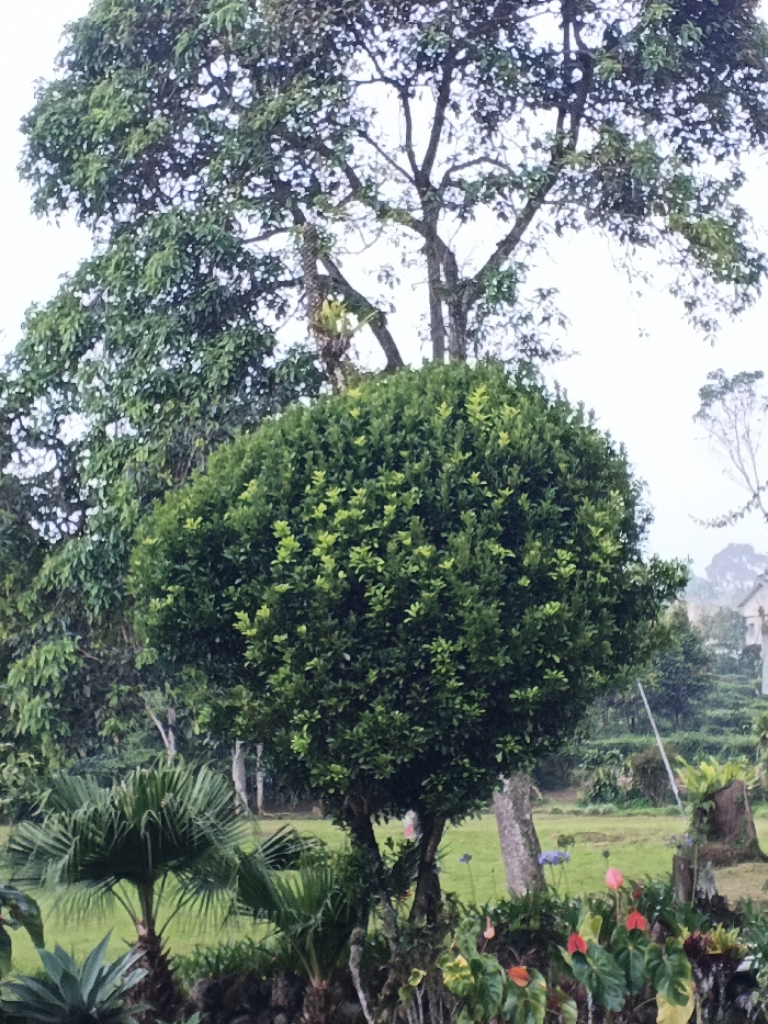The image depicts a lush, green outdoor scene, identified as being in the city of Akshatau, Kazakhstan. The foreground features a dense garden bed containing several small palm-like plants with fan-shaped fronds and various broad-leafed plants. Prominent among these are several flowering plants, including red and pink anthuriums and a purple flower resembling an Agapanthus, all rooted in dark soil or small rocks. Dominating the central midground is a large, spherical, densely foliated green shrub. Behind and to the left of this shrub, a tall tree with a visible trunk and multiple branching limbs extends upwards, covered in green leaves against a bright, overcast sky. Another large tree with dark green foliage is partially visible on the far left. The background consists of a sloping or terraced landscape covered in green grass and scattered trees. On the far right background, a light-colored building with a sloped roof is partially visible, nestled among the distant foliage. No individuals or animals are present in the scene, and no specific actions or interactions are depicted. The lighting is diffuse, indicative of an overcast day.