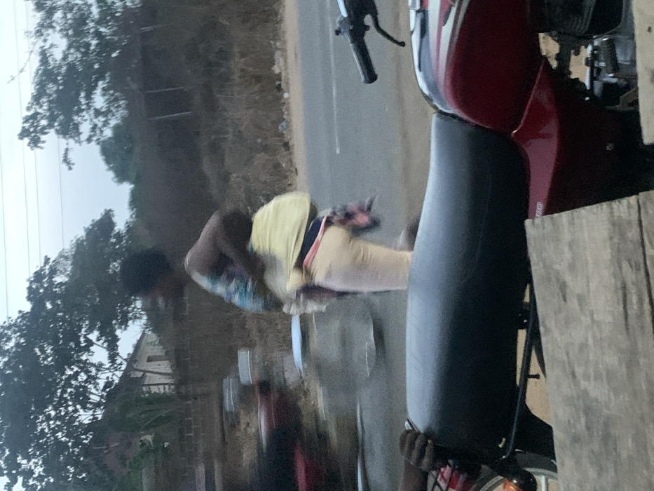 A person rides a bicycle on a road next to a motorcycle. The cyclist wears a sleeveless top, tan pants, and a yellow garment. The motorcycle is red and black with a gray seat. Trees and a building appear in the background. The image seems slightly blurred, suggesting motion or a shaky camera.