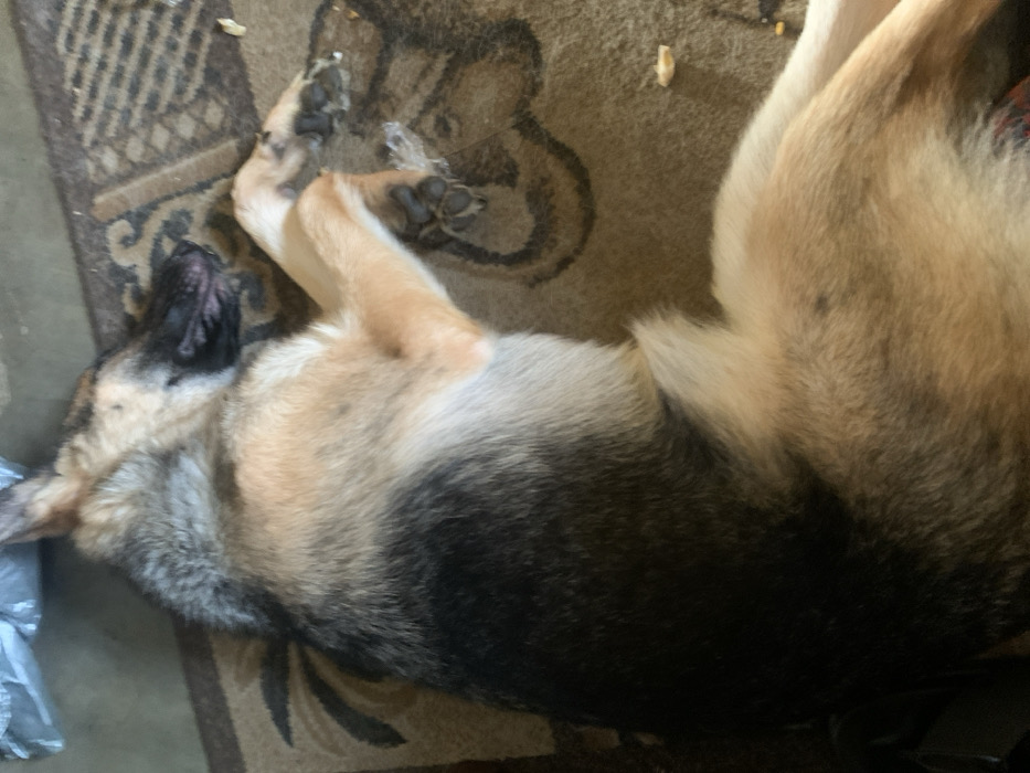 - "This image captures a sable-patterned German Shepherd dog lying on its right side on a patterned rug, in what is likely an indoor setting within Aba, Nigeria" by FM-PaOZQ2, licensed under CC BY 4.0