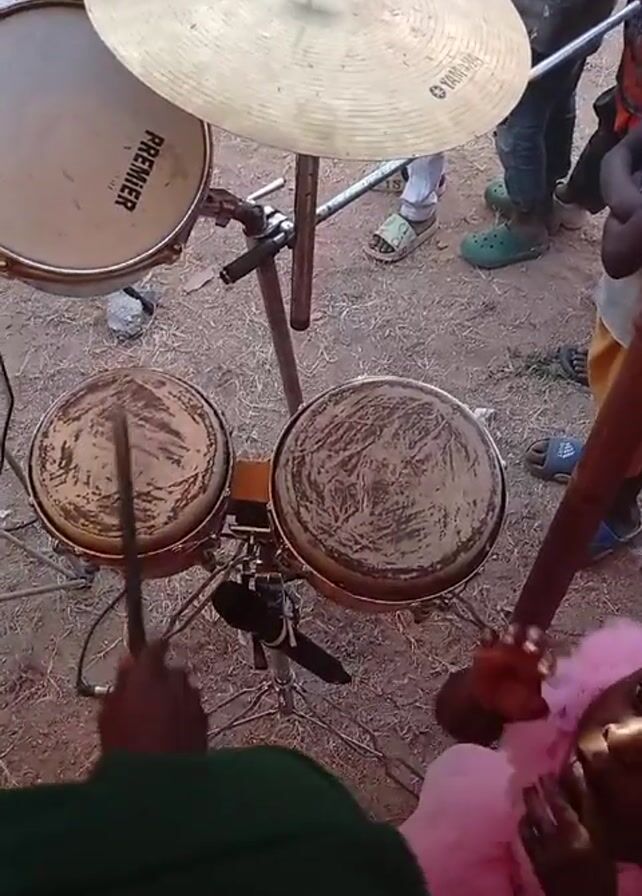 musician playing a small drum set outside on a dirt surface