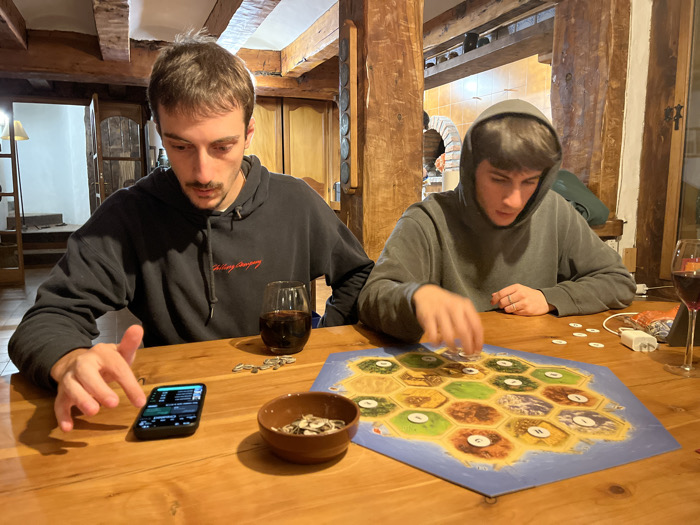 Two young men play Settlers of Catan at a wooden table. One man in a black hoodie looks at his phone. The other, wearing a gray hoodie, arranges pieces on the game board. A glass of dark liquid sits between them, next to a small bowl of game tokens. A charger and additional tokens lie near the board's edge. Exposed beams and wood paneling form the room's rustic interior.
