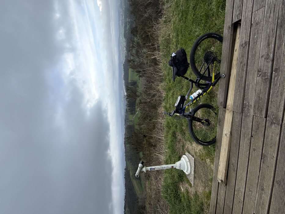 The image displays an elevated scenic viewpoint in A Gueima, Spain, under an overcast sky. In the foreground, a dark wooden slatted platform features a partially dislodged plank. To the right, a dark blue and yellow full-suspension mountain bike, equipped with a water bottle and both frame and saddle bags, stands upright. To the left of the bike, a white, coin-operated public viewing telescope, marked with graffiti on its column, rests on a concrete base. The ground immediately beyond the platform is covered in dry, brown and green grasses and low-lying scrub. The background reveals a wide panorama of rolling hills covered in trees and cultivated green fields, extending to a distant city or town that includes a faint body of water. The sky is predominantly grey with heavy clouds, showing a slightly brighter patch towards the upper right. No people are visible.