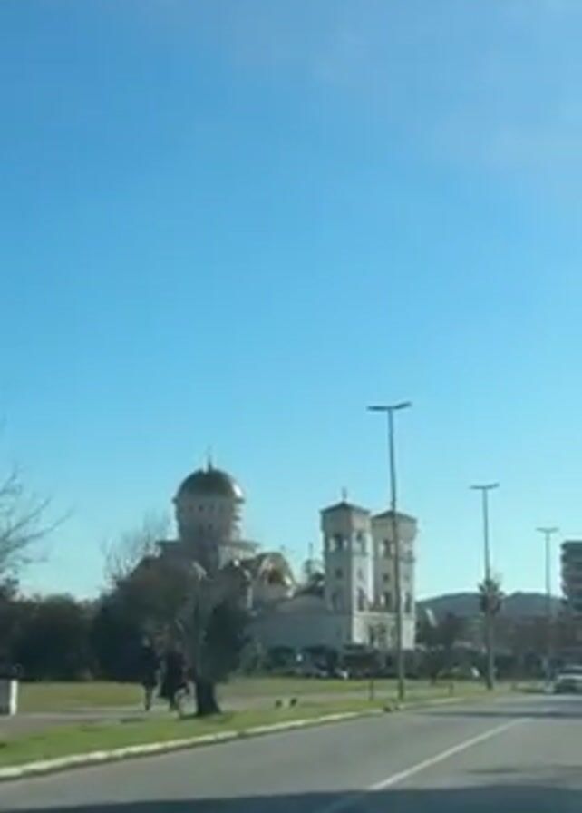 car driving down a road in a town on a sunny day. On the right side of the road, there is a large church with golden domes and white towers. There are streetlights on the side of the road, and a few cars are driving in the same direction. The sky is clear and blue.