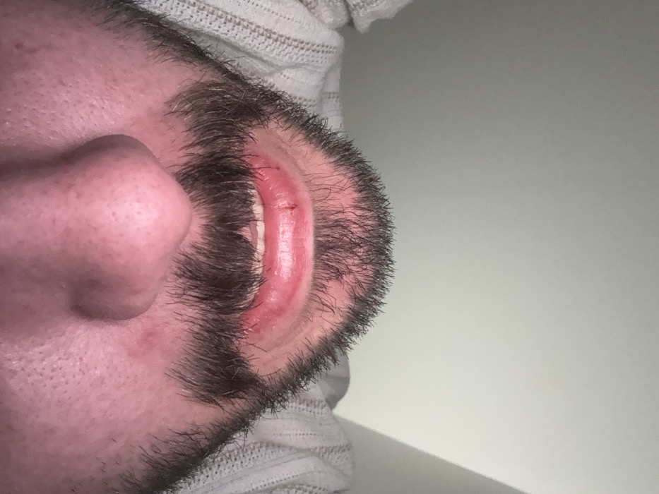 Close-up, side view of a man's face. His nose is prominent, and he has a dark beard that outlines his jawline and extends towards his lip. The inside of his lower lip is visible, appearing swollen and inflamed with a small cut. The man's skin is fair, and some hair is visible on his head. A textured grey and white surface is visible near his head, possibly fabric. A plain wall is in the background.
