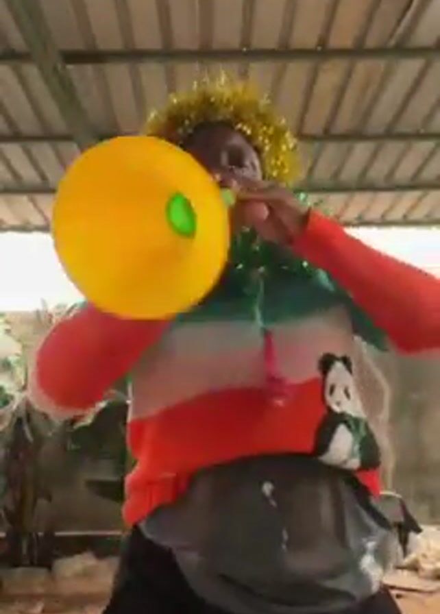 A person wearing a yellow wig and a green tinsel garland around their neck is standing under a metal roof structure, outdoors. They are holding and blowing into a large, yellow and green horn. The person is wearing a colorful striped sweater with a panda graphic, black shorts, and a black fanny pack. Banana trees and sacks of material are visible in the background. The person moves the horn in front of their face while blowing into it, creating a loud noise.