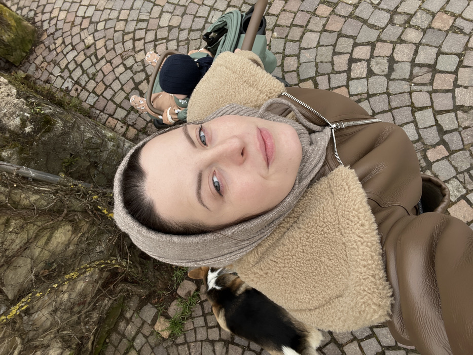 This image captures an outdoor scene in the city of Meisenheim, Germany. An adult female occupies the foreground, looking directly into the camera. She wears a light brown ribbed hood and a brown leather jacket featuring a tan sherpa-style collar. Her dark hair is visible beneath the hood, and she has blue eyes. To her left, a tri-color dog, primarily black, white, and tan, is visible on the cobblestone pavement. To her right and slightly behind her, an infant is seated in a green stroller with a brown handle. The infant wears a dark blue hat and light-colored booties patterned with animal motifs. The ground consists of multi-colored cobblestones. In the upper left background, a stone or concrete wall is covered with leafless vines and patches of yellow-green lichen, with small areas of green grass visible at its base.
