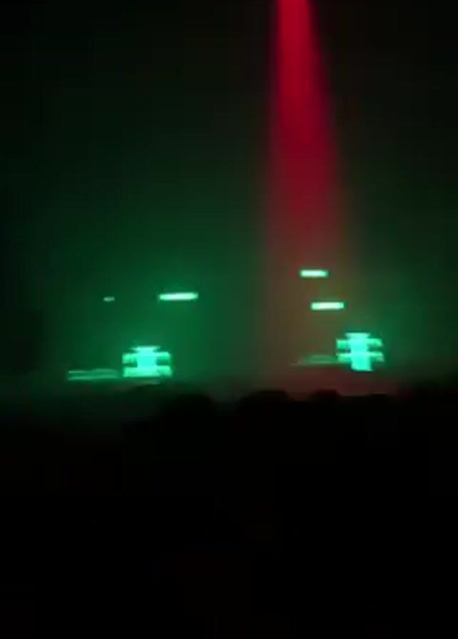A concert is being performed in front of a large crowd. The stage is decorated with two screens displaying red and green pixelated graphics. Bright red and green lights flash during the performance.