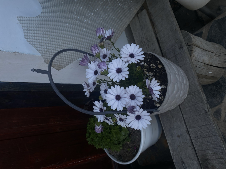 The scene is an outdoor setting in Vlado Trichkov, Bulgaria. A light-colored, textured ceramic pot containing numerous blooming African Daisies (Osteospermum) with white petals and dark purple centers, along with several purple-tinged buds, occupies the central foreground. A dark grey metal arch-shaped handle is attached to the pot. This pot rests on a surface constructed from weathered wooden planks. To the left, a white plastic pot containing a dense green shrub is partially visible. In the background, to the left, a dark reddish-brown wooden door or paneling is present. To the right, a wall displays areas where light-colored plaster has peeled away, revealing a textured, dimpled substrate, with a pale blue paint visible above the exposed section. No individuals or animated subjects are depicted.