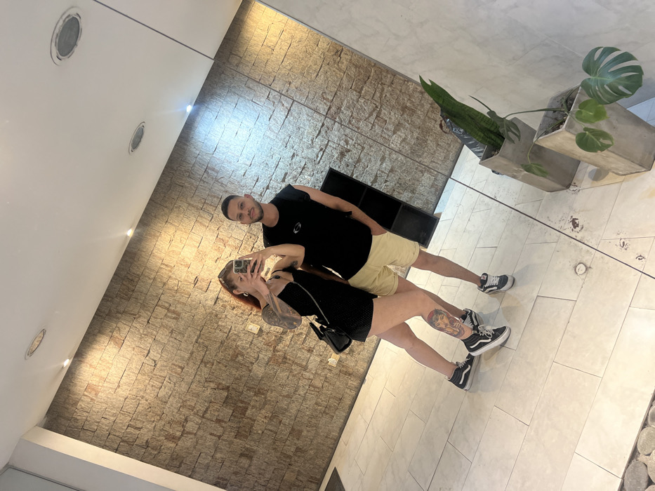 A couple stands in front of a wall of stone bricks, posing for a selfie. The woman, wearing a black dress and sneakers, holds up her phone, revealing her arm and leg tattoos. Beside her, the man sports a black t-shirt and khaki shorts, also in sneakers. A geometric plant pot with a snake plant and monstera plant stands nearby. Recessed ceiling lights are visible above. The scene is likely an interior space with tiled flooring.