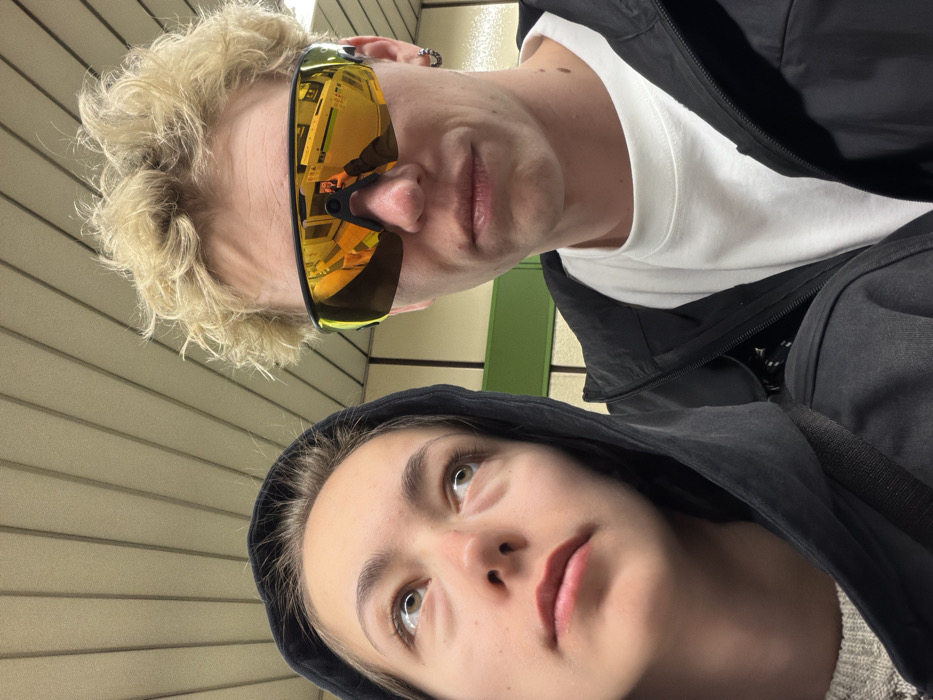 Two people are shown in a tilted selfie. The person on top has short, light-colored hair, wearing sunglasses with a yellow tint reflecting a scene. A white t-shirt is visible under a dark jacket. The person below wears a dark hoodie, pulled up, and looks upward with light eyes. The background appears to be a wall with horizontal lines. There are vertical green accents.