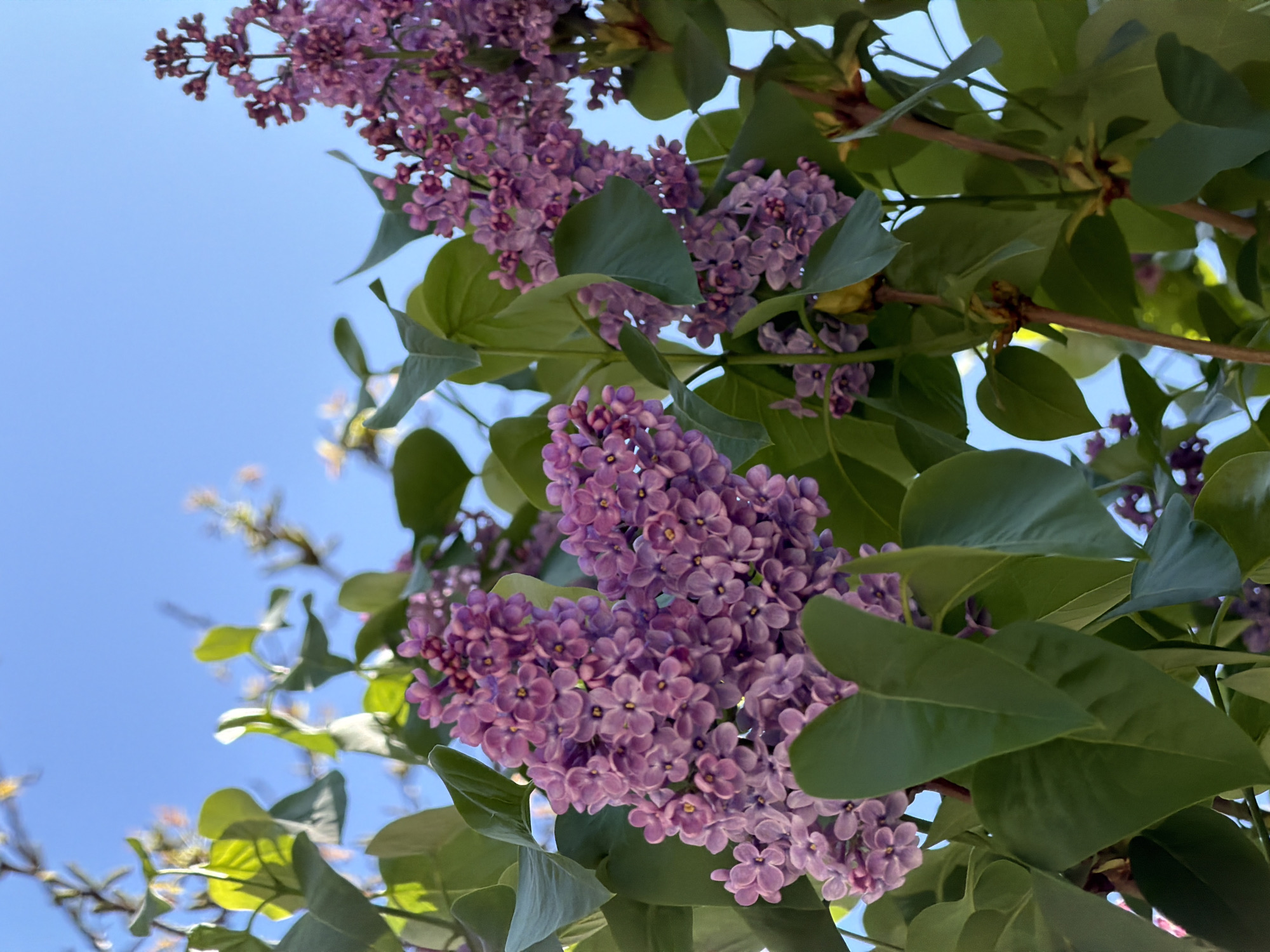 - "low-angle view of purple lilac flowers blooming with green leaves against a clear blue sky" by FM-0qQUs1, licensed under CC BY 4.0