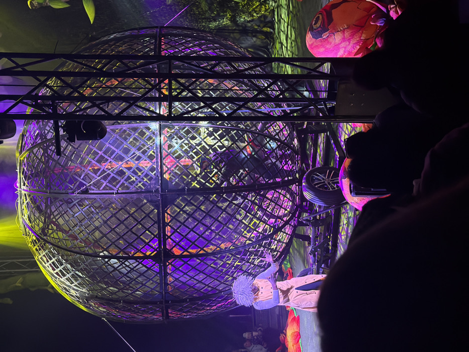 This image depicts a dynamic indoor performance scene, presumed to be taking place in Bretton, United Kingdom. The central subject is a large, spherical metal cage, commonly known as a "Globe of Death," constructed from dark metal bars forming a diamond lattice pattern. Inside the lower section of the globe, a motorcyclist is visible on a motorcycle, appearing to be actively engaged in or preparing for a stunt. The globe rests on a mobile platform that includes a visible car wheel with a silver, multi-spoke rim. On a dark stage in the foreground-left, a performer with light-colored, frizzy hair is positioned, wearing a long, light-colored (possibly beige) coat over dark trousers. This individual is gesturing with both hands outward, palms slightly open, seemingly addressing the audience or presenting the act. The stage is illuminated by vibrant stage lighting, primarily purple and yellow. A strong yellow spotlight illuminates the top of the globe, while purple and pink lights cast reflections across the cage and the stage floor. The background includes dark elements suggesting a backdrop or additional stage props, with hints of green foliage or painted scenery visible on the right, also lit with purple and green hues. Large, decorative, flower-like props in red and orange are scattered on the stage floor, notably to the left of the performer and in the far bottom-right. A black metal truss structure stands vertically on the right, supporting a stage light directed towards the globe. The immediate foreground shows blurred silhouettes of audience members, some with hands raised holding phones, indicating a live performance being observed and recorded.