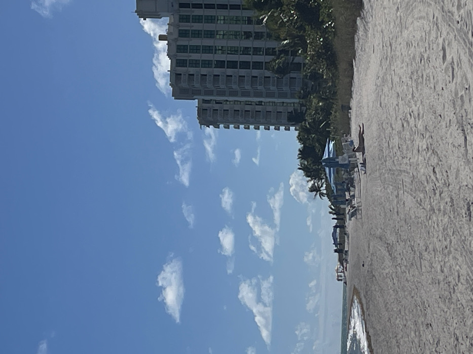 A beachfront scene showcases a tall building adjacent to palm trees. The beach features rows of chairs and umbrellas. A person is visible lying on the sand. Above, the sky is a vibrant blue with scattered, wispy clouds. The shoreline where the beach meets the ocean is captured at the bottom of the frame.